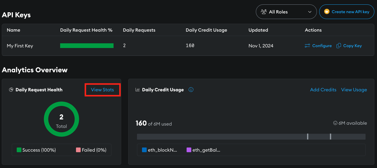 The dashboard displays an overview of your daily request health and credit usage. Select View Stats or Stats (in the left navigation) to monitor your project request stats.
